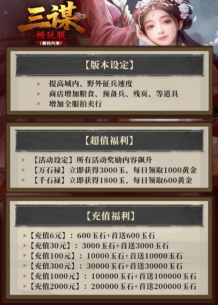 一款以三国背景的策略手游,主打“降肝减负”的轻度SLG玩法,核心特色在于便捷的自动铺路、武将练兵、预定攻城等功能,让玩家更专注于策略搭配,拥有镇军、青囊、神行、天工、司仓、奇佐等六大职业,通过招募武将、发展城池,在三国世界中展开策略博弈